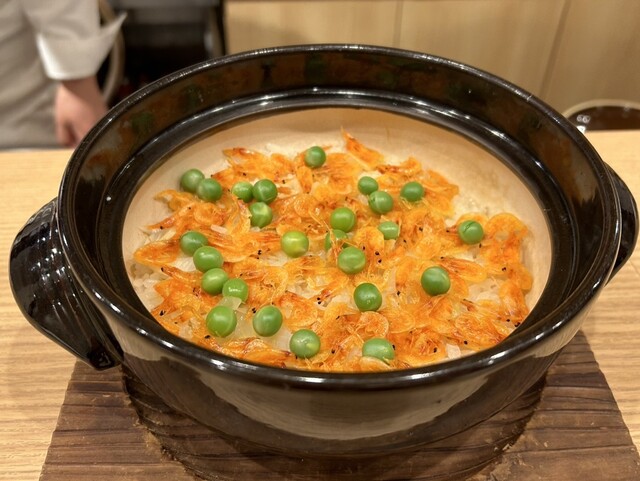 土鍋で炊かれた駿河湾の桜エビご飯は、独特のエビの味と食感が秀逸。残ったご飯は、おにぎりにしていただき持ち帰りました。