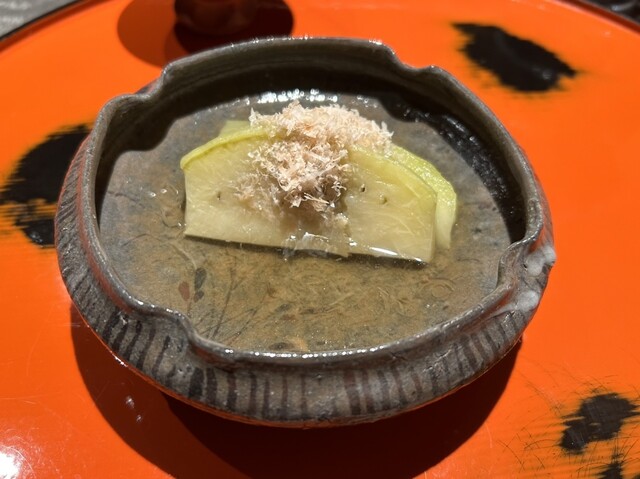 太刀魚は骨がなく、下処理の丁寧さを感じました。ふっくらで鬼おろしジュレの酸味が効いて旨い!