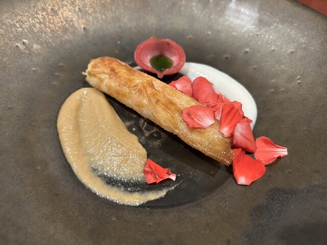 薩摩甘えびの春巻き、とうもろこしの焦がしソースと新玉ねぎのソースで