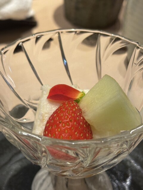アカモクのお味噌汁で落ち着き、デザートは苺とメロンで軽やかに締め。