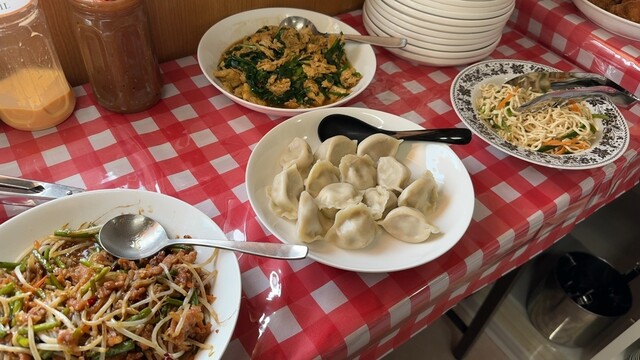 チョイスメニューから"エビチリ"をオーダーし、料理を待つ間にニラ玉や鶏の唐揚げ、麻婆豆腐、水餃子、サラダ、チャーハン、スープ、デザートの果物や杏仁豆腐などを好きなだけお皿に取っていただきます。しかもおかわり自由。程なくしてエビチリ登場。大きなエビが10尾も!えーと...このエビチリだけでも1080円以上するでしょ普通?なのに他のもの食べ放題でこのお値段?ウソでしょ?厨房からは中国語のやり取りが聞こえ、全ては本格的な本場中華料理のお味で本気のやつです。いやすごいお店が出来たもんだなと思ったら何と1/13で閉店するのだそう。ホントにもったいない!最初で最後のランチかも知れません。最後に杏仁豆腐をいただきました。美味しかったです。ごちそうさまでした。