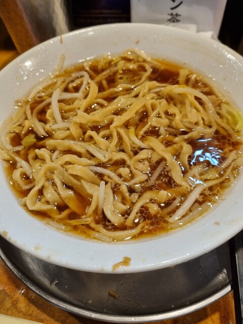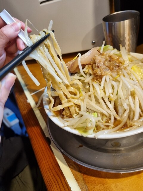ニンニクパワー注入、シャキシャキもやしに旨い脂、濃いめのスープに絡む平打ち麺。