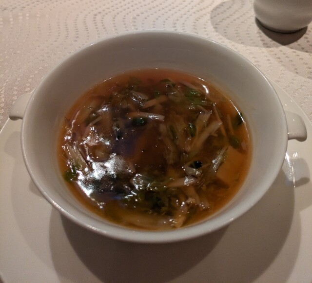 1月下旬という箱根としてはシーズンオフの時期でしたので私達の他に客は二組だけでした。今回はカジュアルランチ3,850円をオーダー。店内は真ん中に吹き抜けとオブジェがあって、中華というより洗練されたニューヨークの高級レストランのよう。