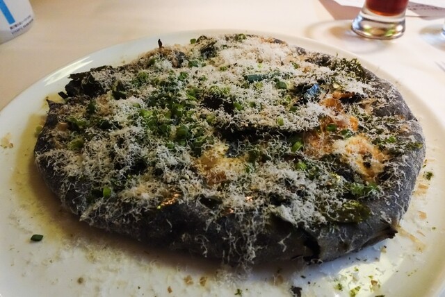 「アンチョビのPizza」は、イカ墨を練り込んだ黒い生地に、アンチョビ、モッツァレラ、セミドライトマト、ケッパー、インゲン豆、ネギ、胡麻を乗せ、グラナパダーノをたっぷりと振りかける。