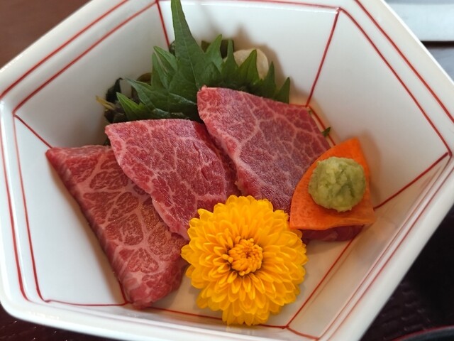 感想としては 肉刺し 海老豆 丁字麩 近江米 北前船ゆかりのこんぶととろろ入りの昆布だしの効いた汁物 薄切りの近江牛リブロース 契約農家の卵 最高によい品づくし 味付けも絶品でした。
