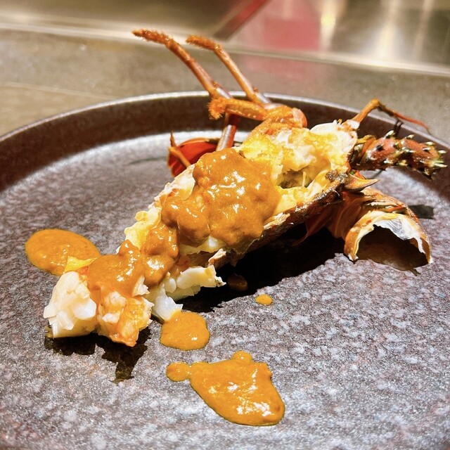 →これ以上ないほどに新鮮な伊勢海老のグリルに伊勢海老のみそ、生雲丹を使った特製ソースがかかっている。