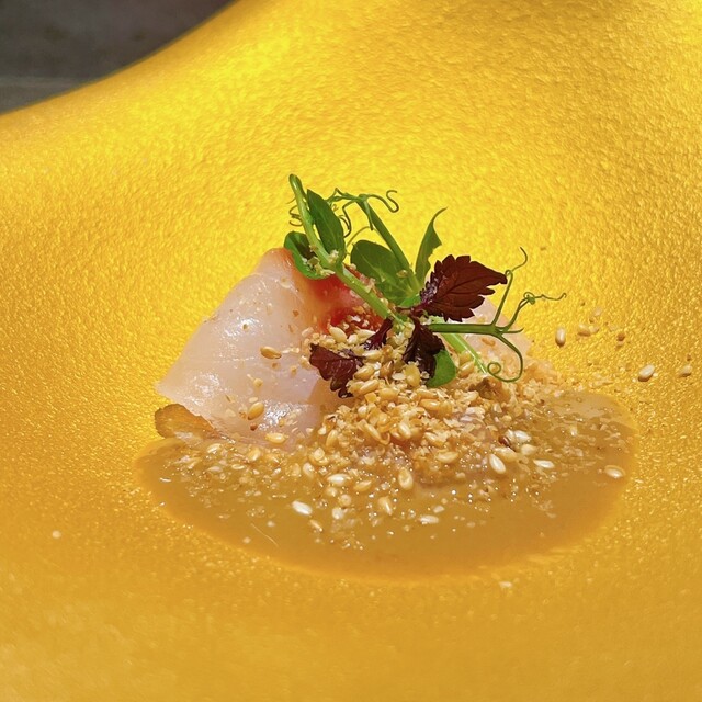 →2日かけて脱水、熟成した真鯛にごまソース、煎りたてのごまがかかっている。