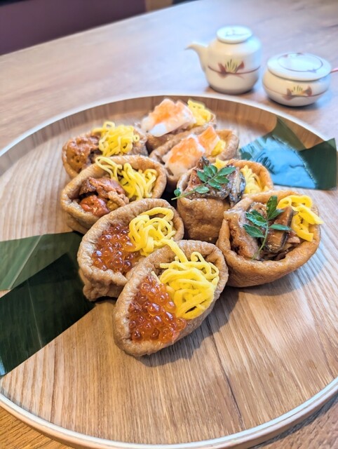 キラッキラの宝石稲荷。雲丹、いくら、海老、鰻などの高級食材がのった贅沢な稲荷寿が目の前に!見た目も美しくてお味も美味しくて食べ応えもありました。