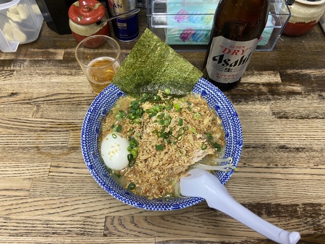 塩らぁめん+あげネギ+半熟玉子(食べログクーポン)+アサヒ中ビンビール