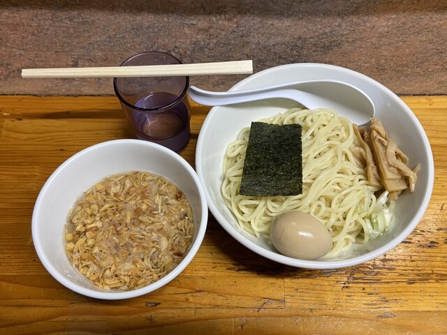 麺側はシンプルな見た目、つけ汁側はフライドオニオンが浮かぶ特徴的な見た目
