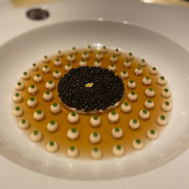 こちらのお料理は皆さん一度は見たことがあるのではないでしょうか? ロブションといえば…のこちらのお料理は、たっぷりのキャビア、蟹、ジュレ、カリフラワーのムースが合わさっています、甘さの中に塩味がアクセントになっていて、美味しくとても贅沢です!