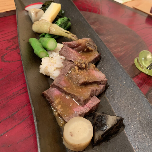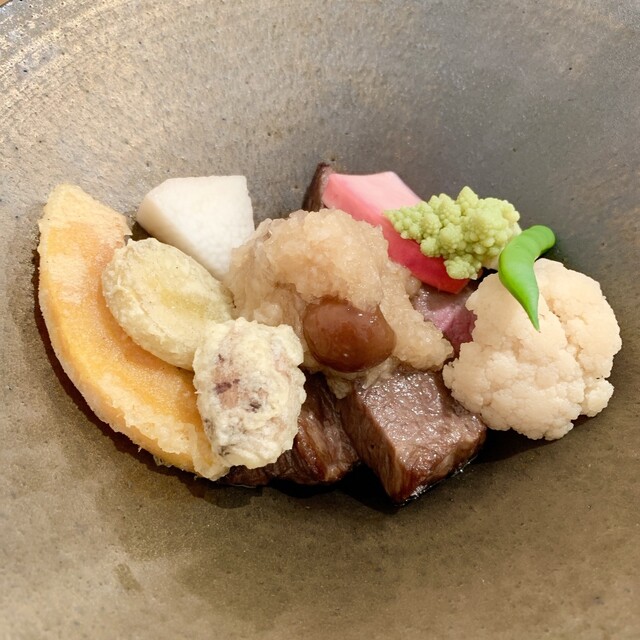 ・宮崎牛のかいのみ、ジャガイモソース山椒掛け