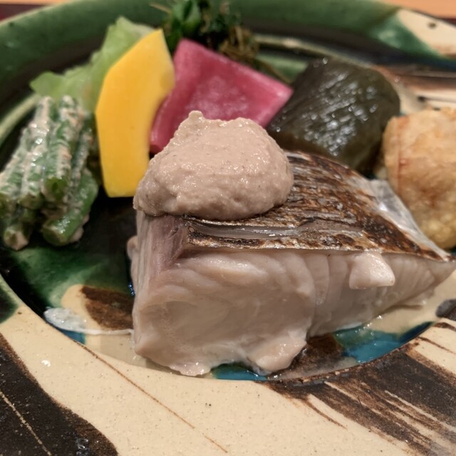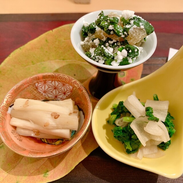 ・あお大豆のお浸し、柿白和え、大根葉、赤大根、ほうれん草とクリームチーズ巻、牛蒡の天ぷら、春菊松風、牛蒡と切り干し大根、安穏芋松風等