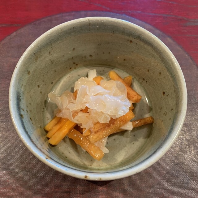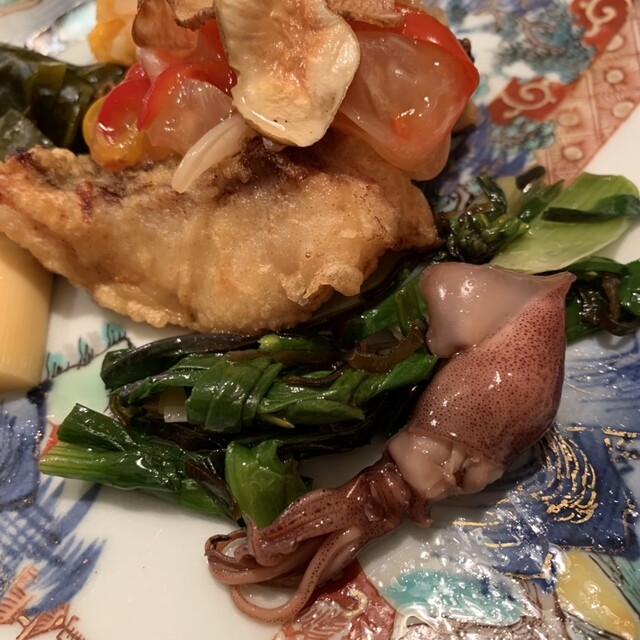 ・若竹煮、わけぎと塩昆布、ホタルイカ、菊芋天ぷら、筍、昆布、オレンジ白菜の甘酢漬け等