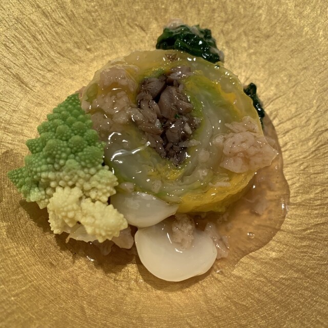 (白菜しんじょ、緑菜の白味噌仕立て)