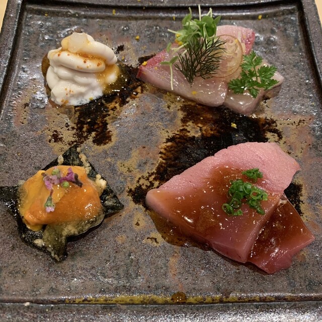 刺身の4点盛は寒ブリ、ヨコワ、白子、ウニ
