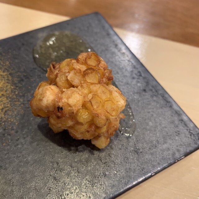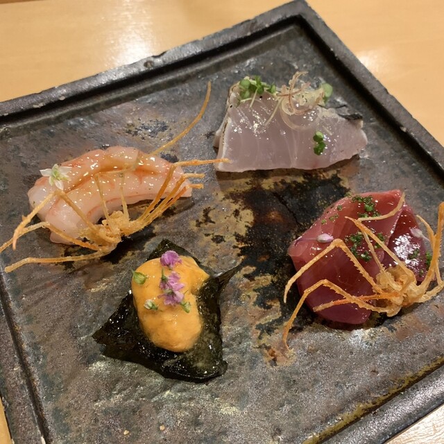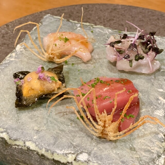 ひらめ、フェンネルの花、かつお、うに・やまわさび、海苔、あまえび