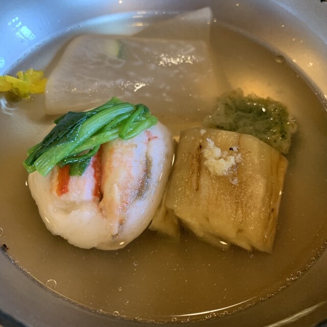 アカムツしんじょ、油揚げ、フキ、セニョール、カブのおすまし