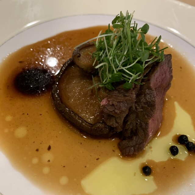 和牛、蒸してから焼き、信長椎茸、つるむらさき、生胡椒