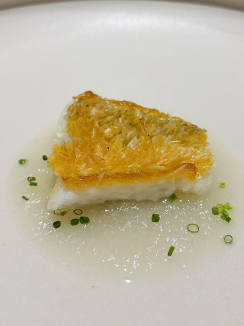 油でゆっくり火を入れ、その後少し炭で炙って仕上げ、アカムツのお出汁をベースに白葱を細かく刻んで、少しとろみを付けて餡のようなスープ。周りには柚子オイルとニンニクを真っ黒に焦がしたものをアクセントに散らしたもの。