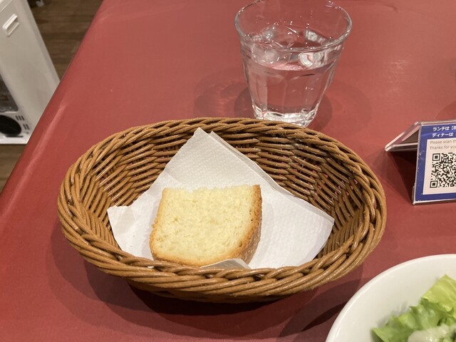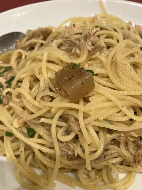 すぐにサラダ、ミネストローネスープ、フカッチャが提供され、10分ほどでパスタが到着しました。ツナと大根、和風です。お醤油ベースの味付けとオリーブオイルが合います。パスタもやや固めで好みです。お皿いっぱいの盛り付けでしたが完食しました。