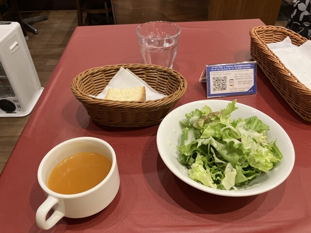 オーダーはスマホでQRコードから。豚肩ロースのグリルが美味しそうだったので注文。サラダ、スープ、パンが付いています。すぐにサラダ、スープ、パンが提供されました。サラダはシャキシャキ、スープもコクがあって美味しい…
