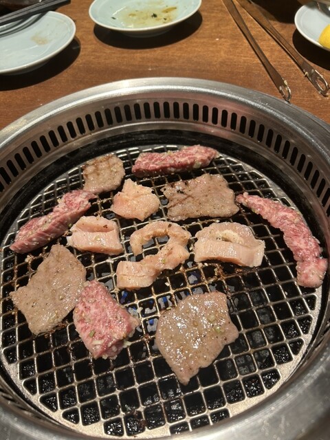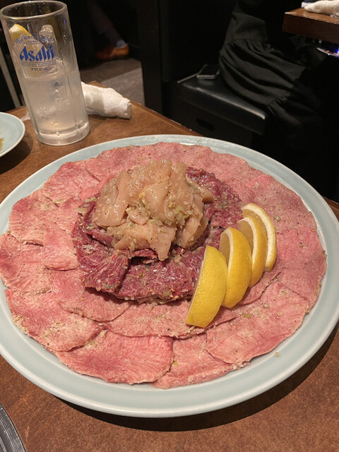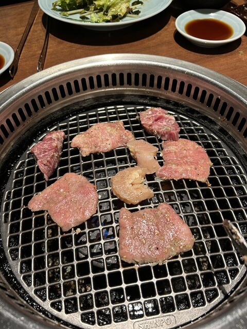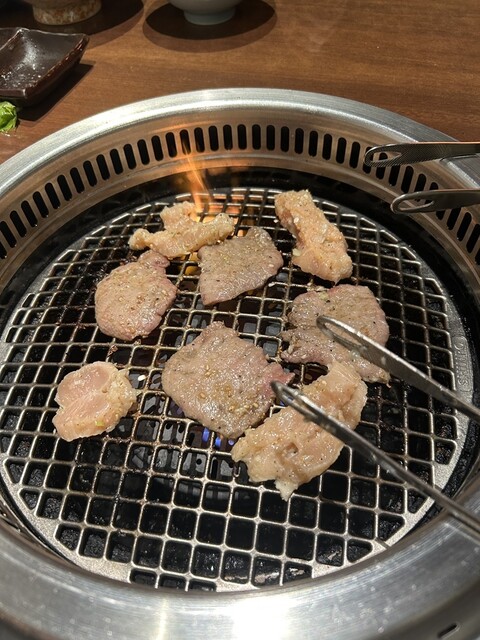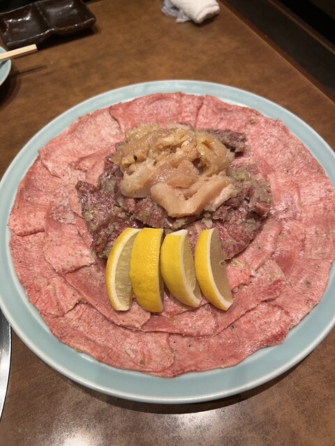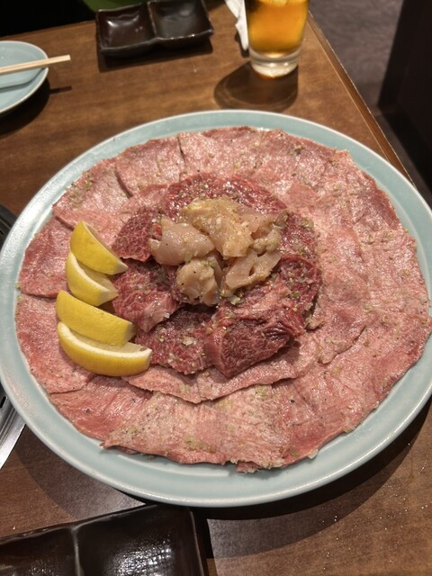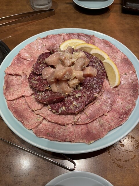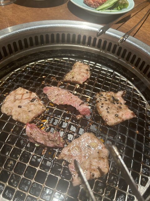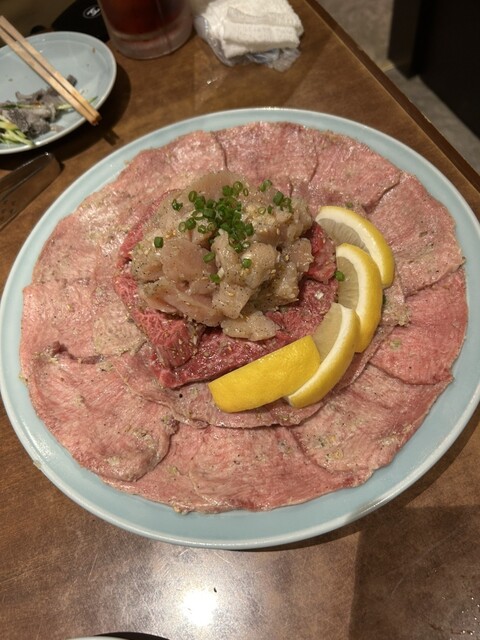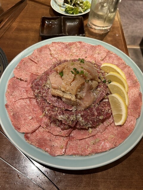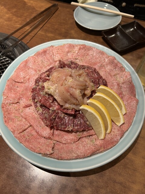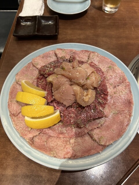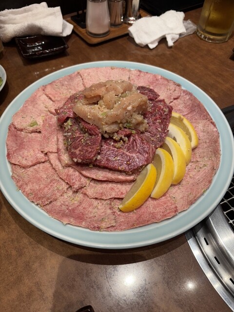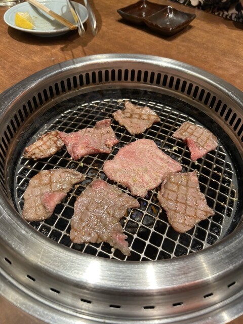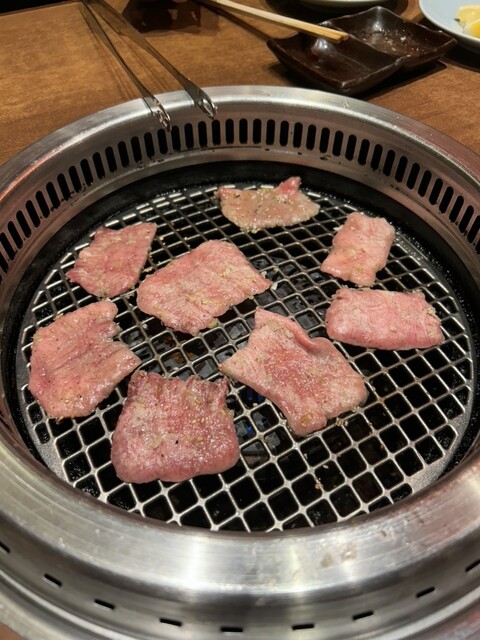 そして、肉の宴がスタート。この店の顔である上タン塩を6人前オーダー。この店のタンの味付けは本当に唯一無二で、他では決して味わえません。その絶妙な塩梅と分厚さ、サクサクとした食感は、何度食べても感動します。