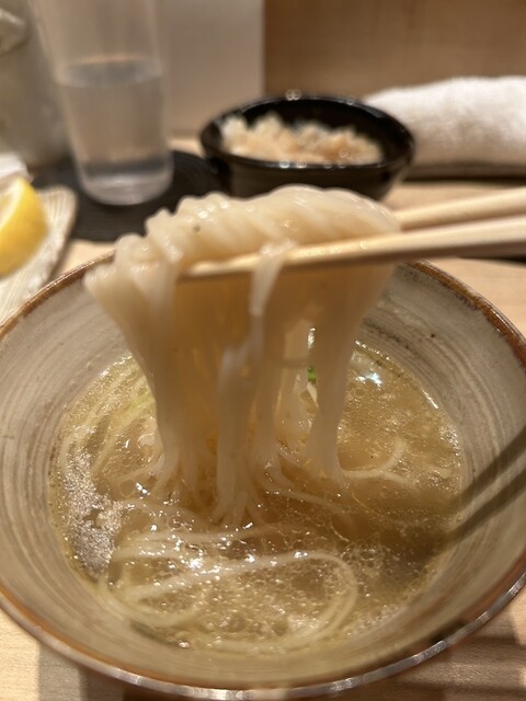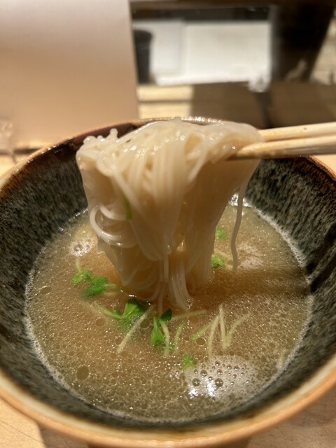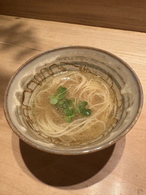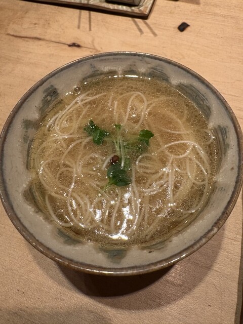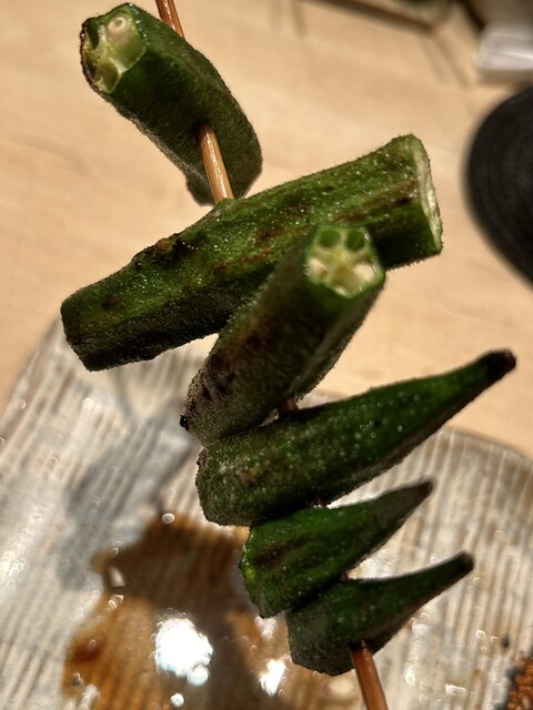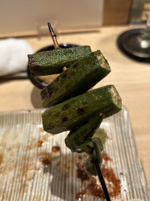 口にしたのは、とろけるような血肝、ジューシーなせせり、パリッと香ばしい皮、独特の食感が楽しい薬研軟骨。野菜串も素材の良さが際立ち、シャキシャキのおくら、とろけるうずらの卵、瑞々しいトマトと、箸休めにも最適です。途中に出される優しい味わいの煮麺は、口の中をリセットしてくれます。