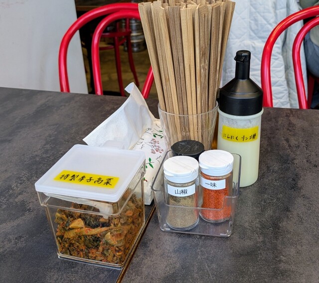 開店10分前の11時25分に到着、平日ですが先待ち12名で順番に券売機で券を買ってテーブルに案内されますが、私の前で満席、残念1巡目では入れませんでした。ただメニューが牡蠣塩ラーメンだけのメニューなので1番目の人は席につくとすぐに提供されていたので10分程の待ちで着席、テーブルは7つなのでタイミングですかね。相席にはしてませんでした。