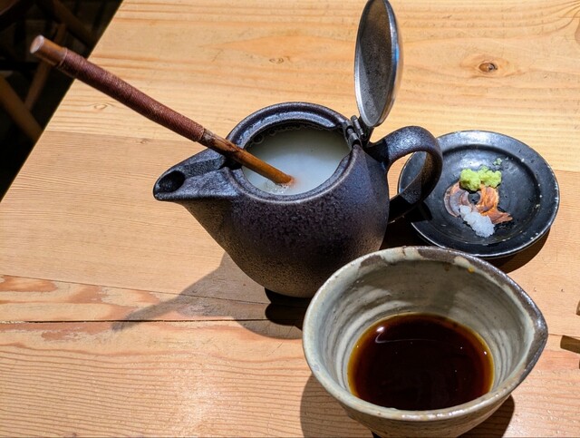 手碾きそばがきのそば粉は、茨城県の有名なそば産地、金砂郷地区の蕎麦を使用してます。そばがき自体は私は初めて?食べましたが、とっても蕎麦の香りや風味がよくわかり美味しいです。わさび、塩、そばつゆでいただきます。