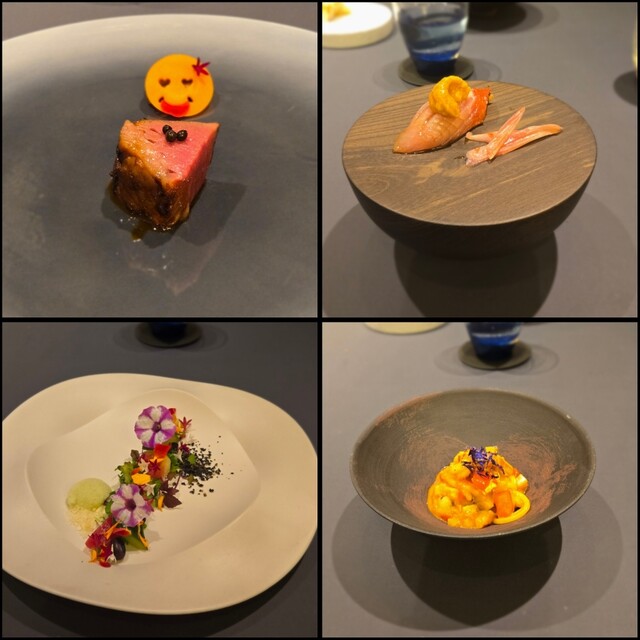 提供されるメニューは、「杉寿司 TYPE-S」「人の向こう側」「立方体」など、その一つひとつが独創的なタイトルと、芸術的な盛り付けに心を奪われます。どの料理も、想像の斜め上を行く組み合わせと味わいで、脳を直接揺さぶられるような感動がありました。料理は化学というのがぴったりなお店です。
