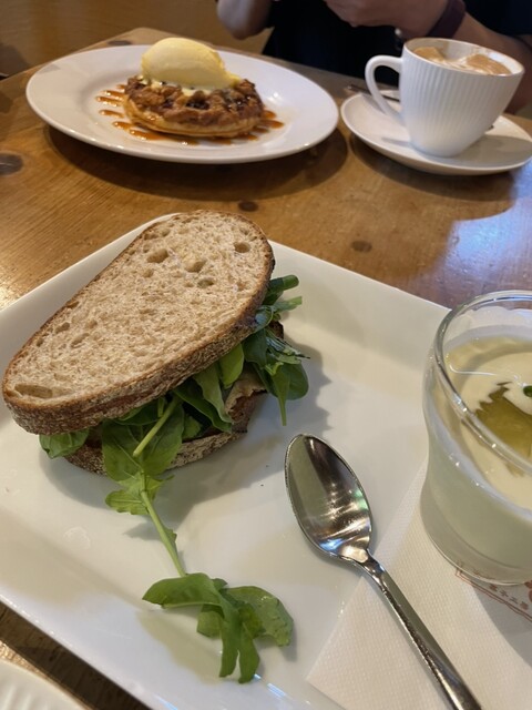 スィーツ、焼き菓子、パンを扱うティクアウト専用のお店と食事の出来るカフェが併設されています。