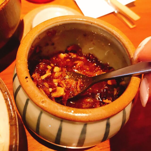 胡麻油ベースに、フライドオニオンとナッツなどが入ってて辛いの苦手な方でも大丈夫です。