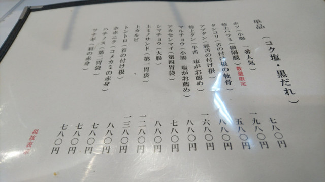 赤(中落ち)、マルチョウ(小腸)、ツナギ(首)、