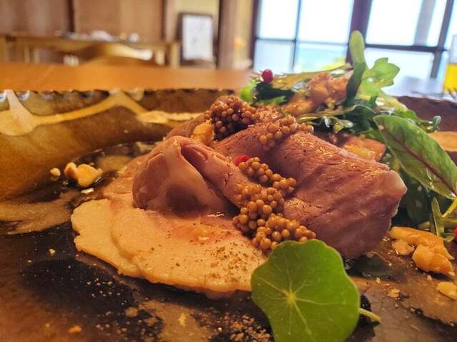 猪肉のポルケッタ風 ストラッキーノ、ハーブのサラダ①