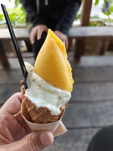 私は手焼きスコーン(+100円)にシークワーサーヨーグルト+宮古島マンゴー相方は柿のソルベと島グワッバをカップでChoice どれも濃厚で美味いっす 1種~3種類は600円・780・960円+プレミアム100円みたい