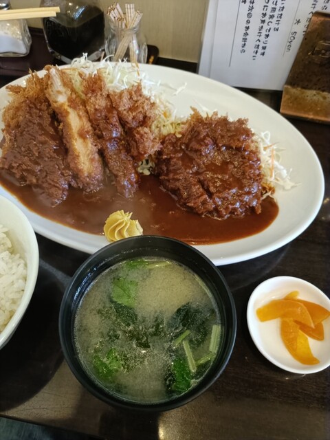 目の前で明るいご夫婦?の店主さんが手馴れた調理捌きに見惚れてると「出来たよ〜!」とご提供 おっ!めっちゃデカいやん やはり定番ロース・ヒレは何方も柔らかく厚めで旨味在り デミグラスソースはあっさり目ながら大量に掛けられて美味い 味噌汁も少し柚子の風味有り 確かにコスパは高いし超人気店で在るのが判りました 堪能堪能 次は海老フライ&ハンバーグを頂きましょう
