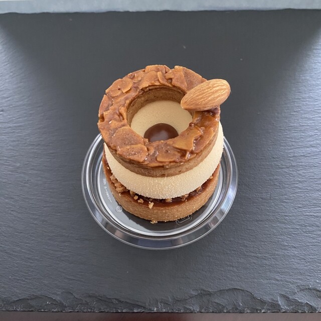 とっても食感の良いアプリコットコンフィ入りのクレームダマンドに、キャラメルヌガーやフロランタン、ガナッシュやムース、タルトなど異なる食感も楽しい アーモンド感もしっかり