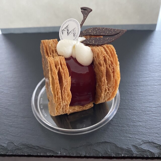 サクサクのフィヤンティーヌ、ほろ苦いムースキャラメル、林檎の風味を閉じ込めたジュレ