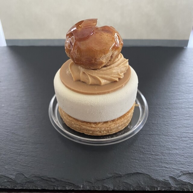 トップのシューの中にはカスタードとキャラメル、キャラメリゼのほろ苦さと食感楽しい シューの土台のキャラメルクリームもしっかりキャラメルの苦味があり チョコは甘め 甘さとほろ苦さのバランスとっても良い 底はサクサクパイ生地
