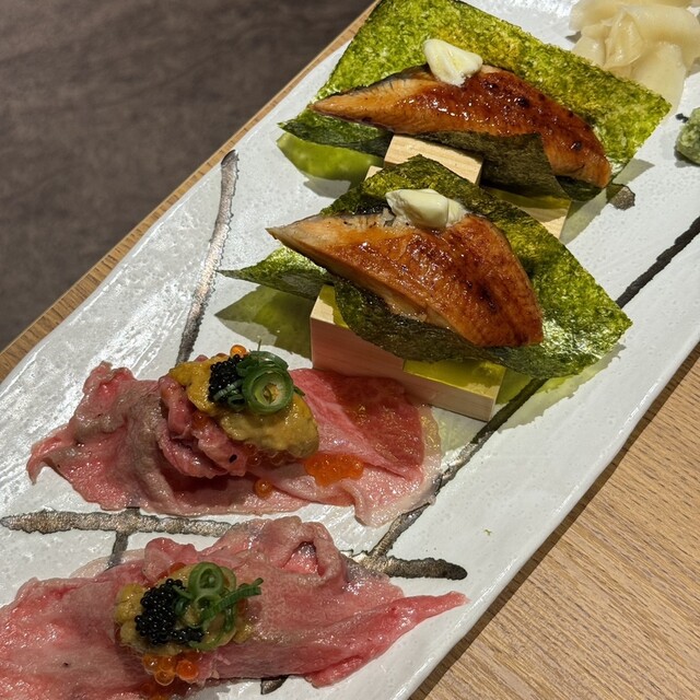つまみ寿司は鰻の炙りバター、炙り霜降り牛肉寿司に雲丹いくらをのせた贅沢仕様。〆は名物の牡蠣飯。大牧壮牡蠣のプリぷり感、牡蠣出汁で炊いたご飯の旨み、仕上げの筋子の塩味が完璧なバランスで必食です。