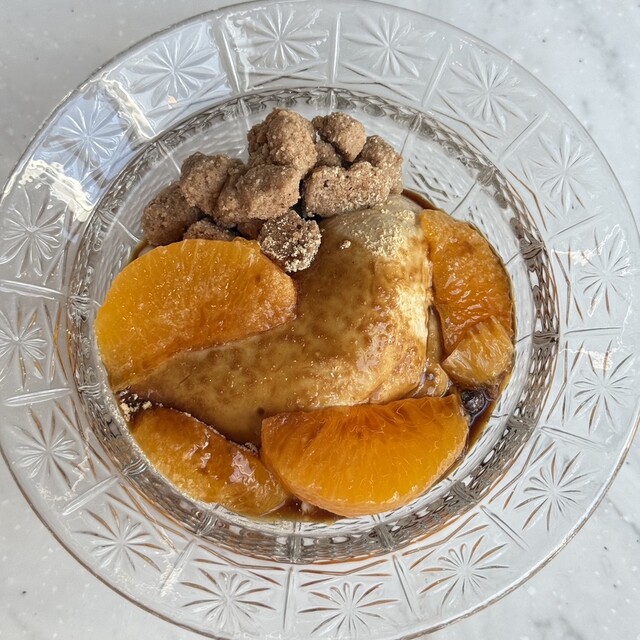 デザートはほうじ茶のパンナコッタ。米粉のクランブル、愛媛県産みかん、黒蜜を合わせた和の要素が心地よく、最後までバランスの取れたコースでした。
