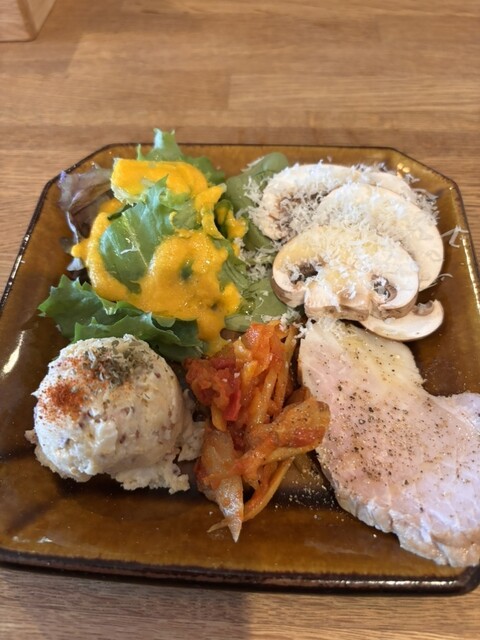 プレートに乗った前菜。とても美味しく生マッシュルームの食感が初めてで楽しかったです♪