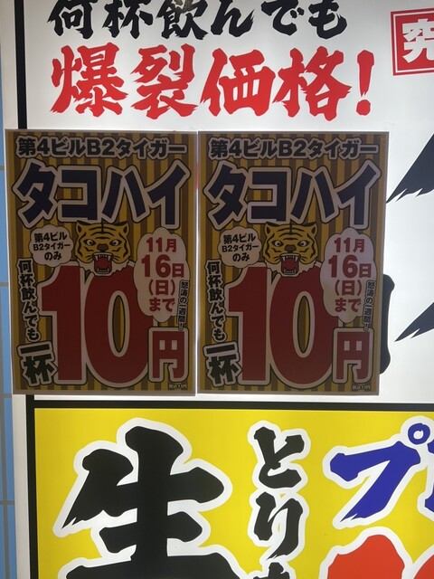 やって来ましたタイガーさんへ。以前から気になっていましたが今回Instagramでキャンペーンしているとの事で。タコハイ一杯10円!コレは来ないとダメでしょ(笑)キャベツの千切りにコレは何?って言う位の餃子の羽だけの様な突き出し。飲み物普段でも安いのに10円なので受け入れます。紅生姜が入ったタルタルが掛かった鳥唐注文。コレだけでタコハイ6杯行けました。こんなキャンペーン一杯して欲しいですね。店自体も大箱で大人数でも大丈夫ですよ。普通に又来ますね。
