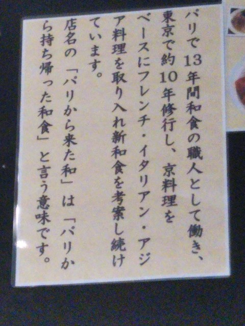 で、店名の由来は、パリで和食職人時代の経験をいかし、パリから持ち帰った和食という意味だそうです。