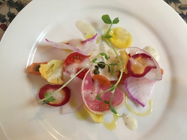 オードヴル/アーモンドとレモンクリームを纏った自家燻製甲斐サーモン地場の季節野菜を添えてフレッシュハーブソース