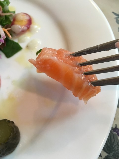 厚切りサーモンは本当に肉厚でサケの旨みが来る来るモチモチ食感!サワークリームと生野菜でさっぱりといただけます。