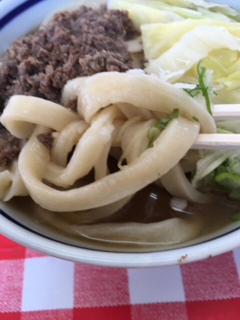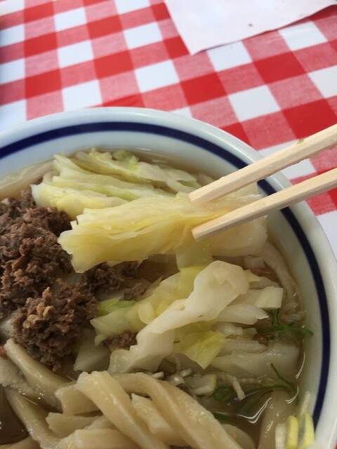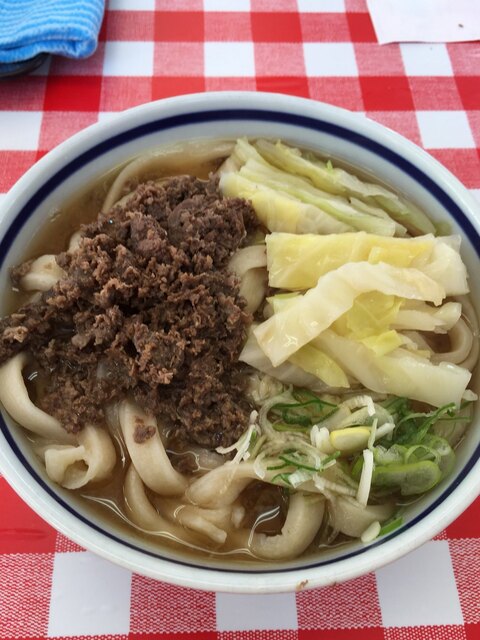 馬肉は必需品。ぶちぶち食感の馬肉バラ系の部分をコトコトと甘辛く煮てあってみうらうどん伝統のうまうまスープにコクを与えます。グルタミン酸の相乗効果で一口目の美味いって感覚が毎回来る幸せのうどん。