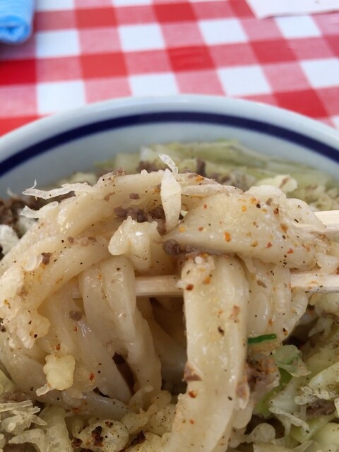 麺は基本的に極太乱切りで長さ硬さ太さバラバラ。いろんな食感が楽しめます。小麦の味が口の中いっぱいに来るやつで中毒性を感じます。