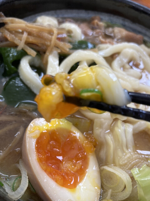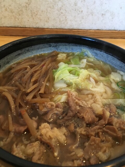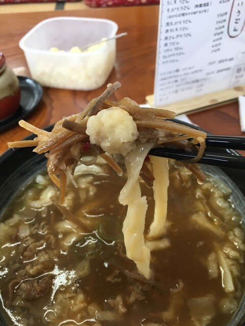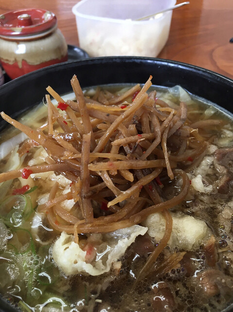 雪かきで疲れた身体に肉うどんキンピラワカメ味玉がイイね!